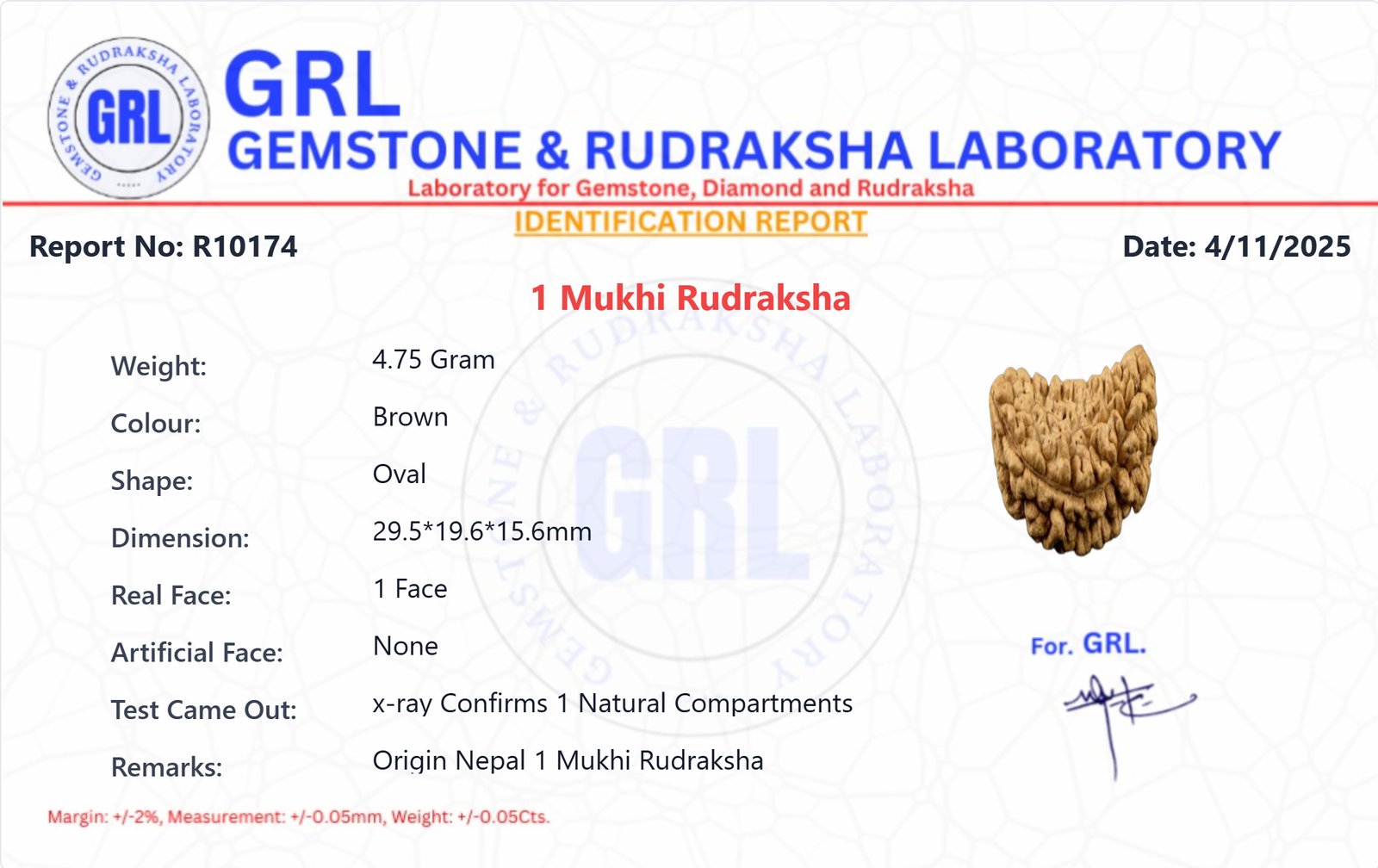 • Comes with lab authenticity certificate mentioning: Origin (India), number of Mukhis (1), Natural seed and other test parameters.